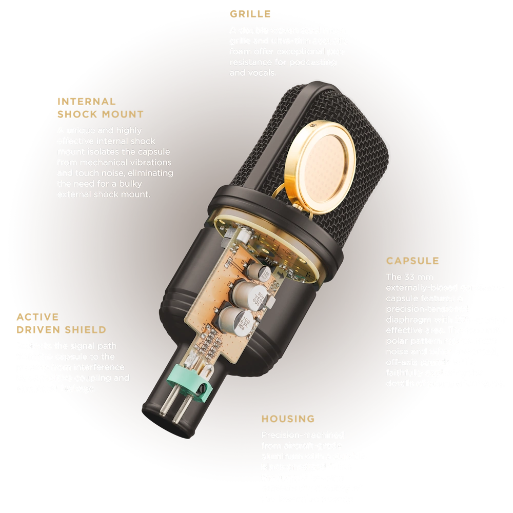 • Externally-Biased True Condenser Capsule — large diaphragm design delivers extended frequency response and natural tonal character for vocals and acoustic instruments