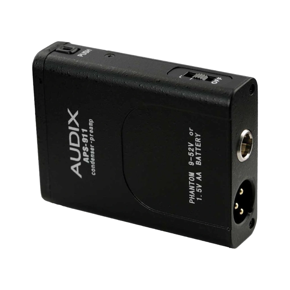 The Audix AX-APS911 is an optional phantom power adapter designed for use with Audix electret condenser microphones in situations where phantom power is not available from the mixing console or preamp. The unit powers compatible microphones via AA batteries, providing a reliable field solution for live performance, broadcast, and installed sound applications. It includes an on/off switch for power management and a bass roll-off filter to address low-frequency buildup in close-proximity applications. The AX-APS911 is included with the ADX10FLP and HT5BG and is compatible with the ADX20iP, ADX40, ADX60, f90, MicroD, and MicroHP.