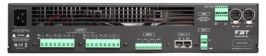 FBT MIURA 604I 6-channel DSP power amplifier rear panel showing input connectors and output terminals