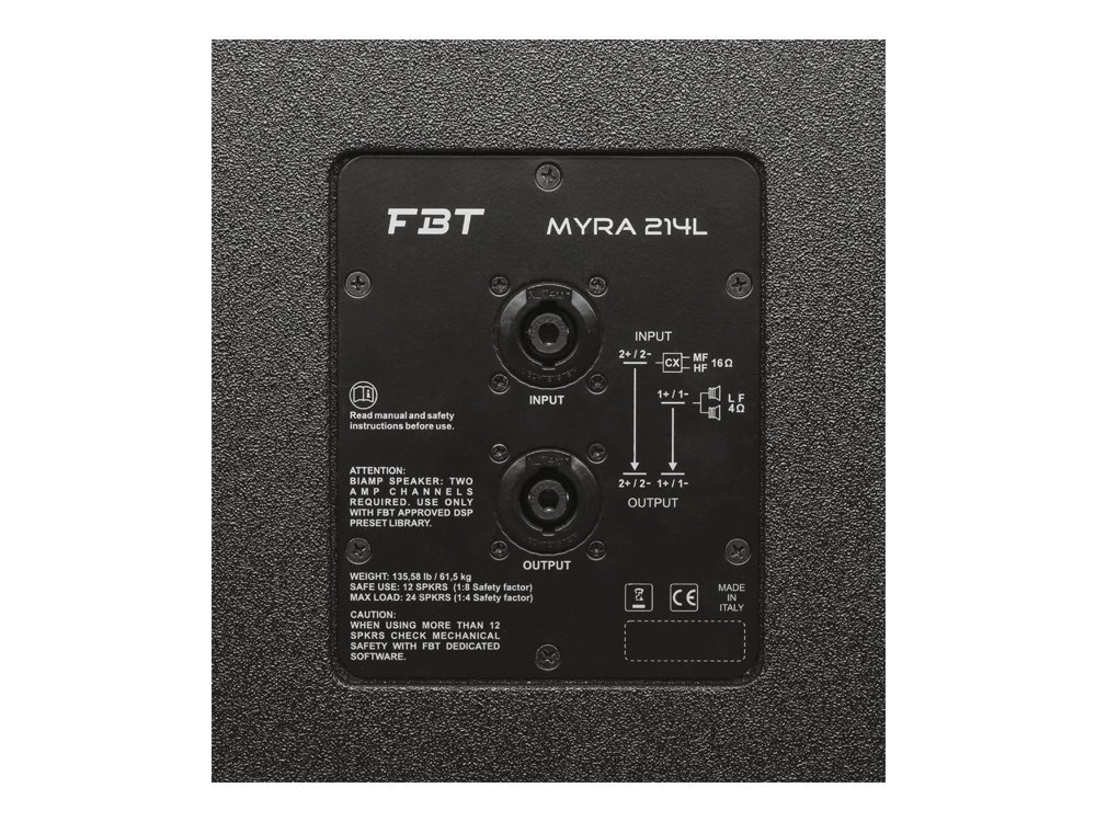 The MYRA 214L is part of FBT’s MYRA 214 ecosystem, which includes dedicated rigging hardware and companion subwoofer and flying frame accessories designed for seamless array assembly and deployment.