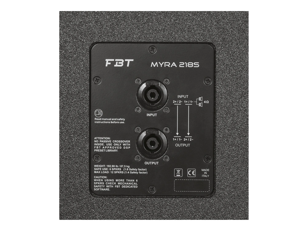 The FBT MYRA 218S is a high-performance dual 18″ bass reflex subwoofer designed as the optimal low-frequency companion to the MYRA 214L line array system. Built to deliver extreme SPL with extended low-end response, the MYRA 218S provides controlled, deep bass reproduction suited to the demands of large-scale touring and permanent installed sound reinforcement. It is the purpose-engineered subwoofer module for system integrators, touring companies, and venues deploying the MYRA line array platform.