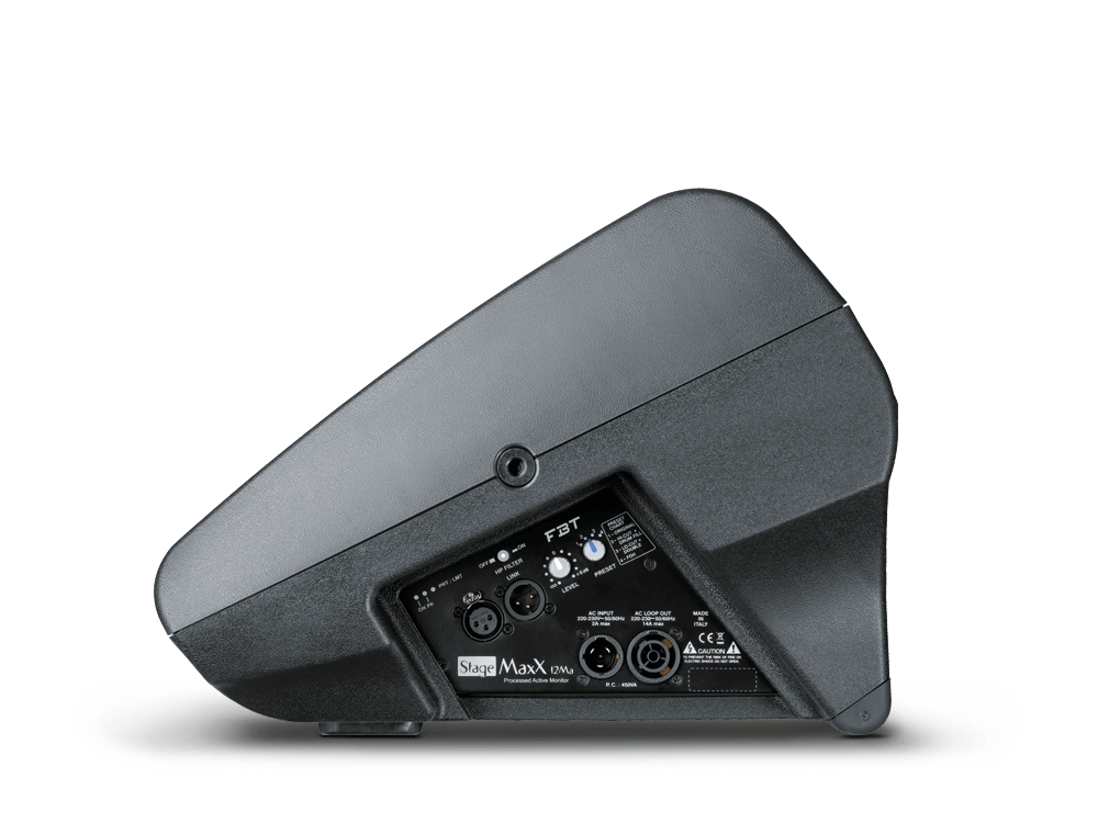 The FBT StageMaxX 12MA is a processed active stage monitor designed for professional live sound reinforcement applications where clarity, output, and compact form factor are all critical. At its core, the system integrates a 12″ B&C custom woofer with a 2.5″ voice coil and a 1″ B&C compression driver with a 1.7″ voice coil, aligned in a coaxial configuration for precise phase coherence and consistent on-axis coverage across the listening position. The coaxial driver arrangement ensures that high and low-frequency components originate from the same point source, delivering a coherent, focused sound field directly to the performer. This monitor is well-suited for touring engineers, stage production companies, houses of worship, and installed venue applications requiring reliable wedge monitoring.