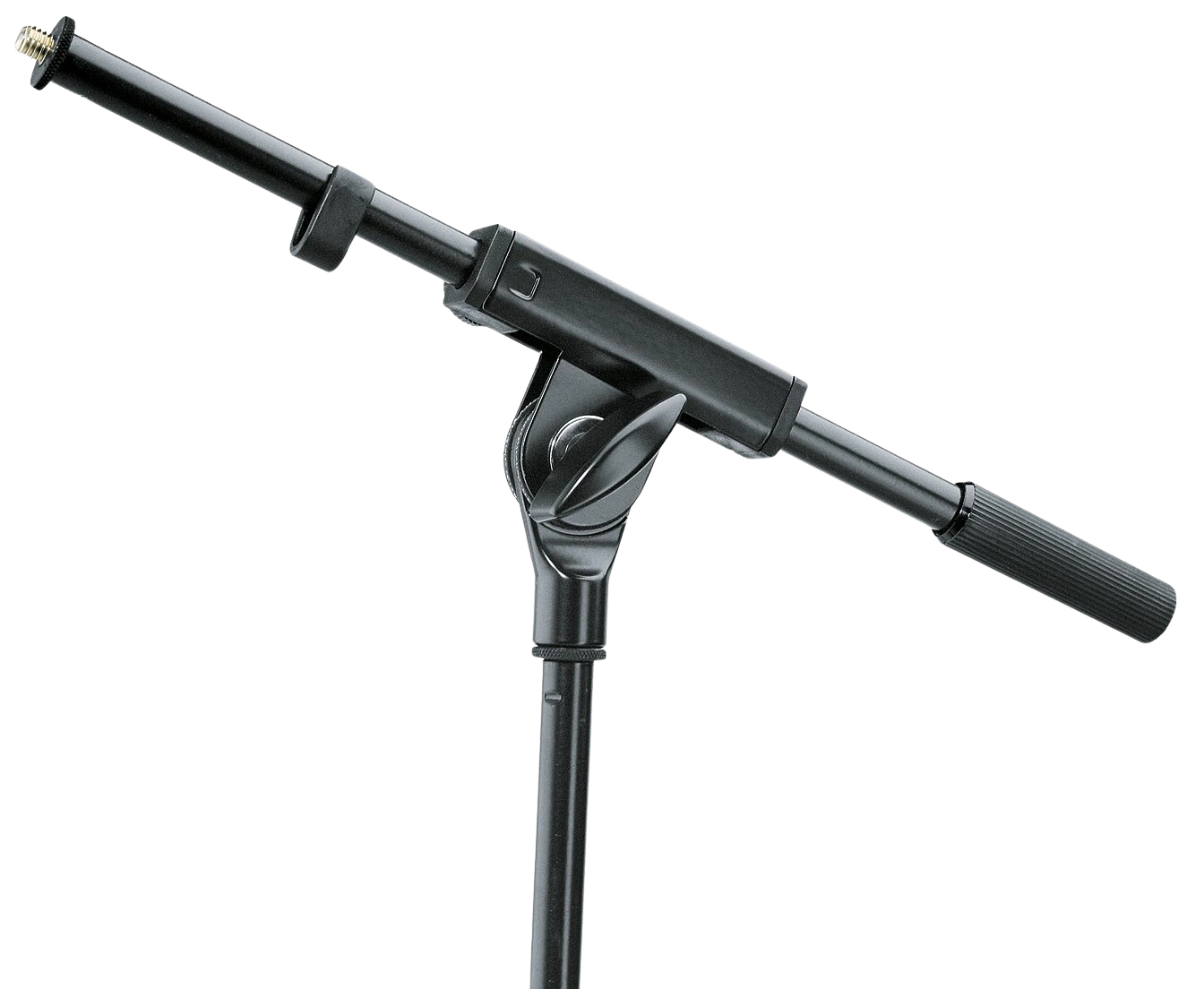 The K&M 21160 is a short one-piece boom arm with 3/8″ thread, designed for professional microphone stand applications requiring reliable positioning and secure locking.