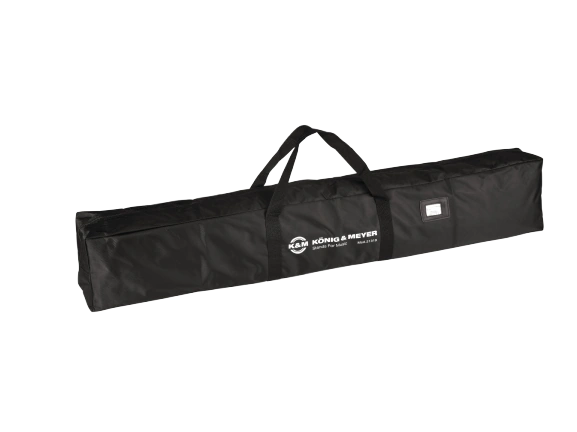The K-M 21319 is a dedicated transport case engineered specifically for two K-M 21472 large XL speaker stands, providing organized and protected carry for touring professionals and live sound crews. Separate inner pockets isolate each tripod from the other, preventing contact damage during transport and storage. The case is constructed from tear-resistant, water-repellent nylon fabric with reinforced side walls for structural integrity under demanding road conditions. It is well suited for touring companies, system integrators, and venue staff who regularly transport large-format speaker stands.