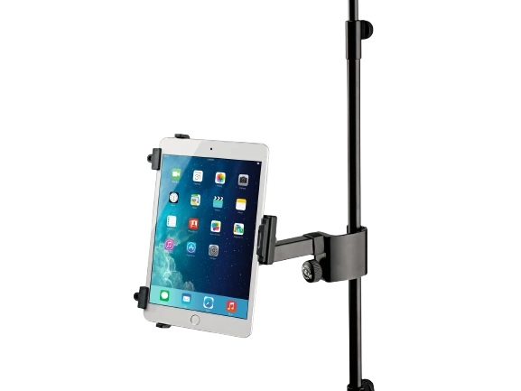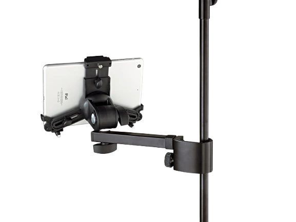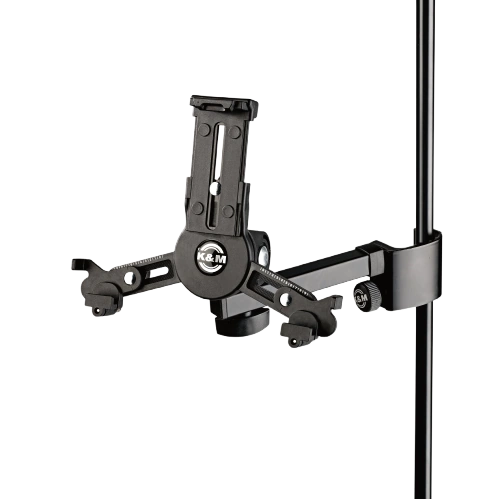 K&M universal tablet holder with black clamp-on mount, front view showing tablet grip mechanism