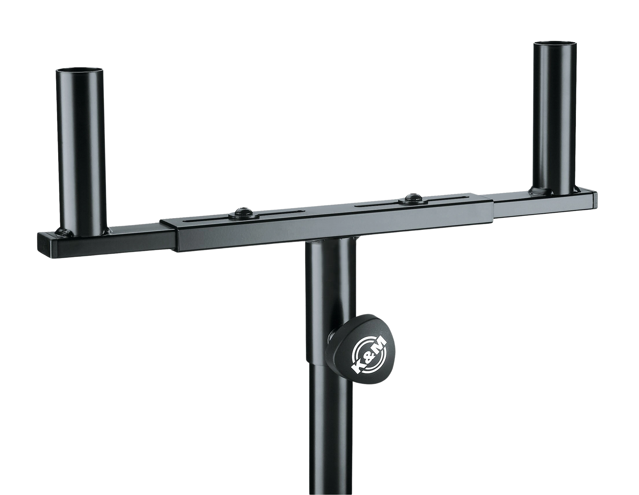 The K&M 24105 Speaker Mounting Fork is a steel tube combination engineered to mount two speakers on a single stand, eliminating the need for separate stands in dual-speaker configurations. Designed to slip onto any 35 mm diameter stand tube, it provides a secure, stable platform with a width adjustment range of 310 to 490 mm to accommodate varying speaker cabinet widths. A locking screw secures the fork in position once set, and the total rated load capacity is 2 x 25 kg. This mounting fork is well suited for system integrators, touring companies, and venue installers seeking a compact dual-speaker rigging solution.