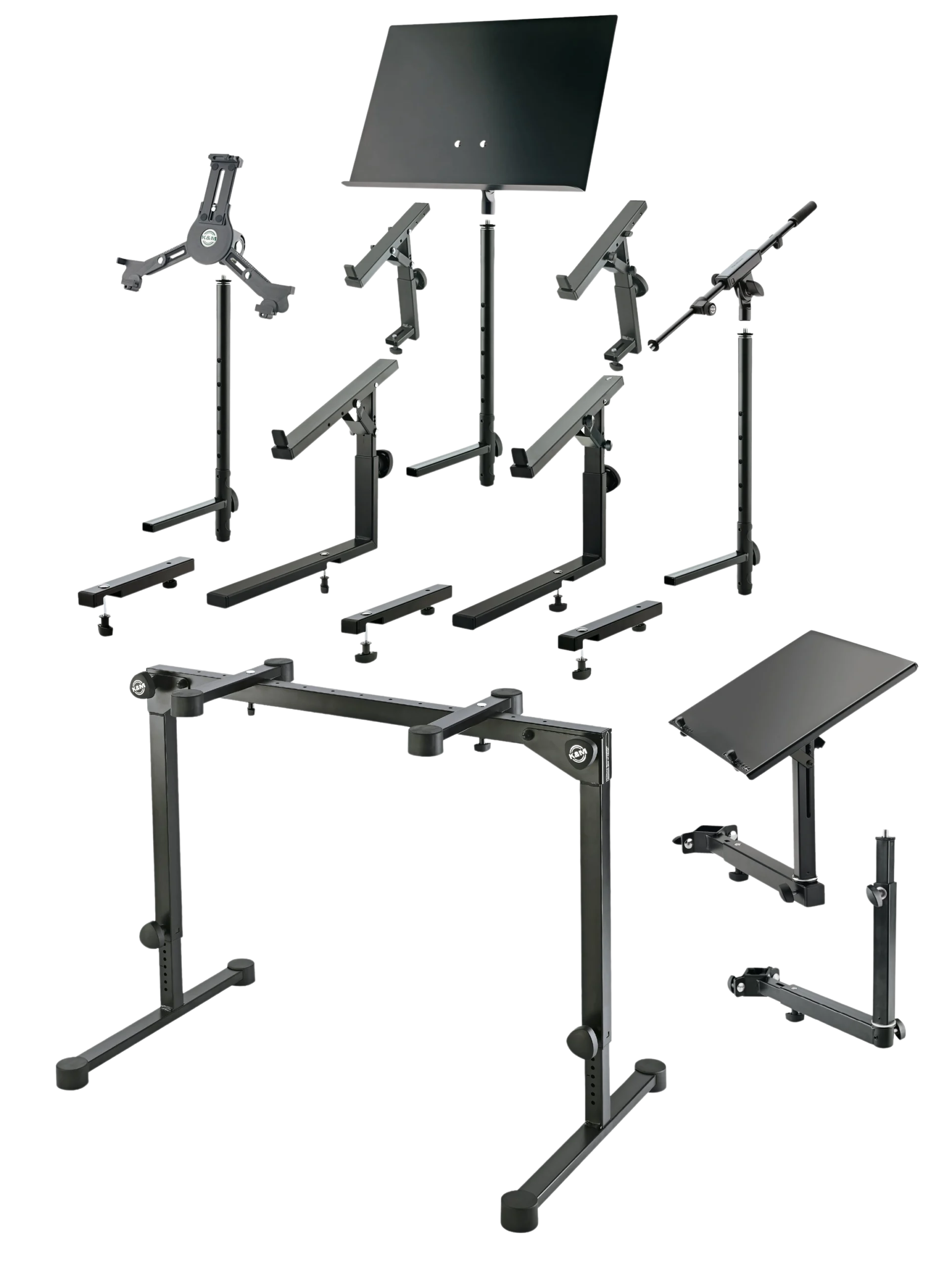 K&M black rack desk stand with adjustable mounting hardware and professional construction