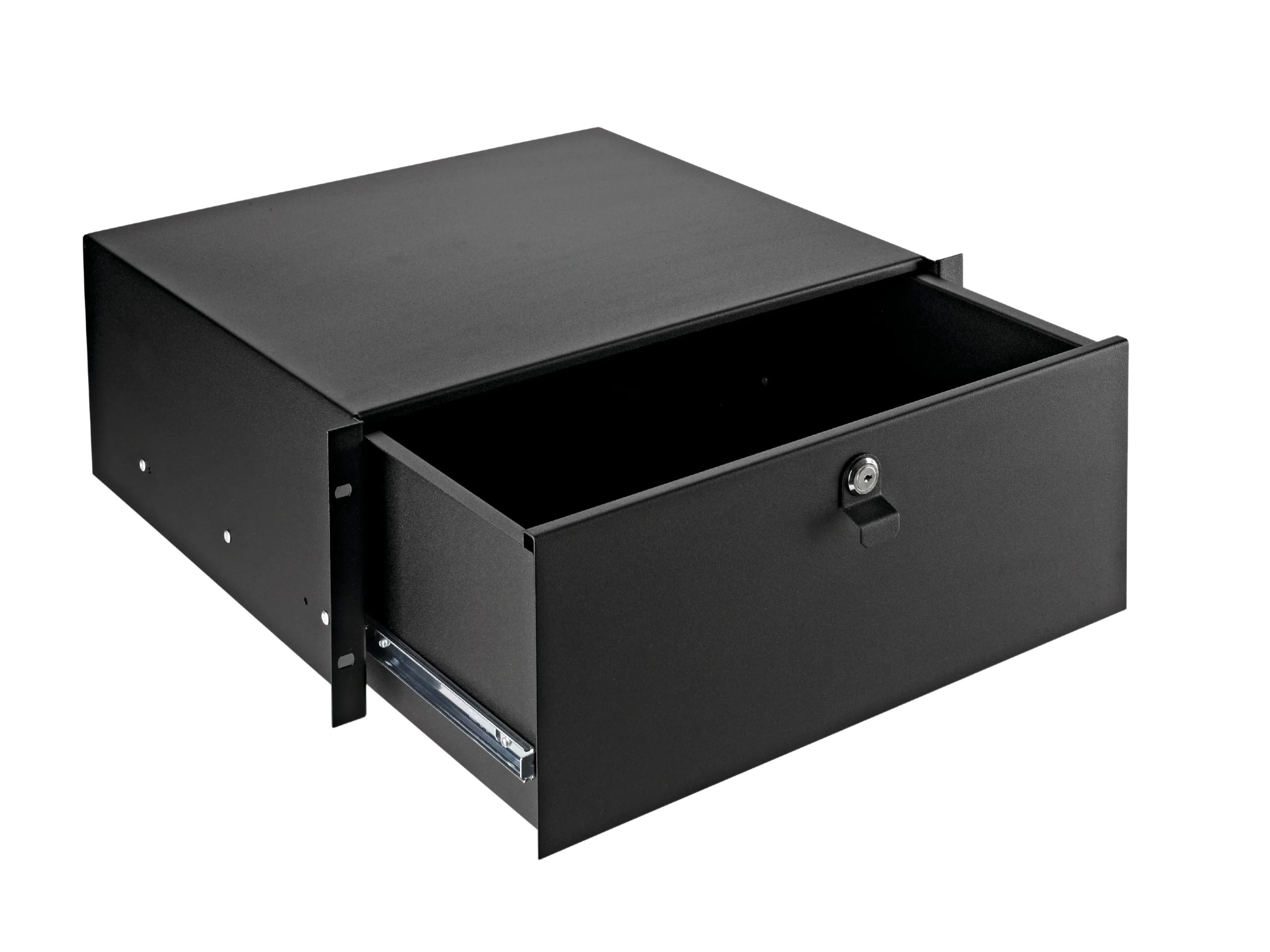The K&M 49124 is a 4U rackmount utility drawer constructed from steel with a black finish, designed for professional rack installations in touring rigs, broadcast facilities, houses of worship, and fixed installations. The 390 mm depth provides substantial storage capacity for cables, adapters, tools, and small accessories within a standard 19-inch rack frame. A built-in keylock secures contents during transport or in shared facility environments. This drawer is suited for system integrators and touring companies requiring organized, lockable storage within an existing rack build.