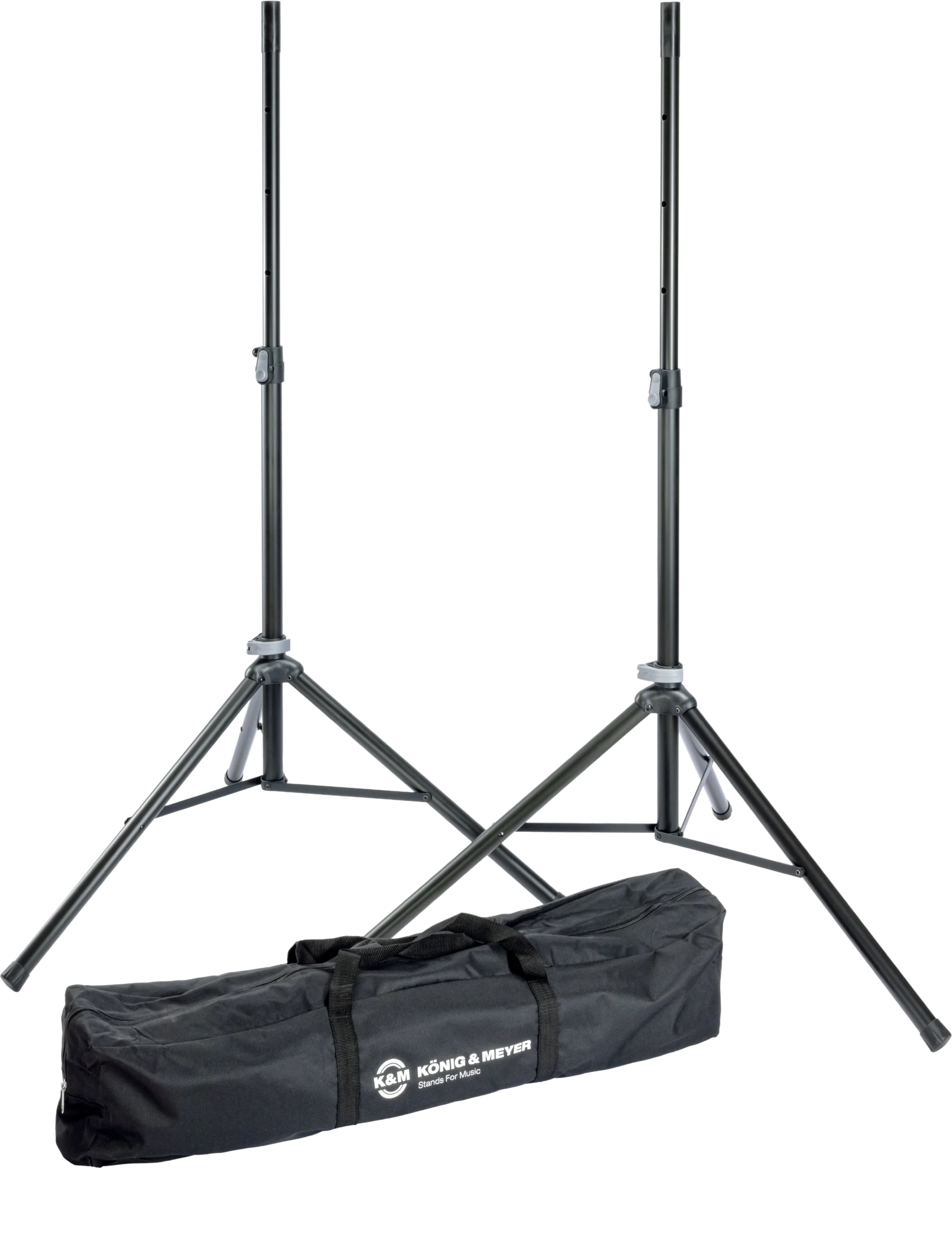 K&M speaker stand package black with included carry bag for transport and storage