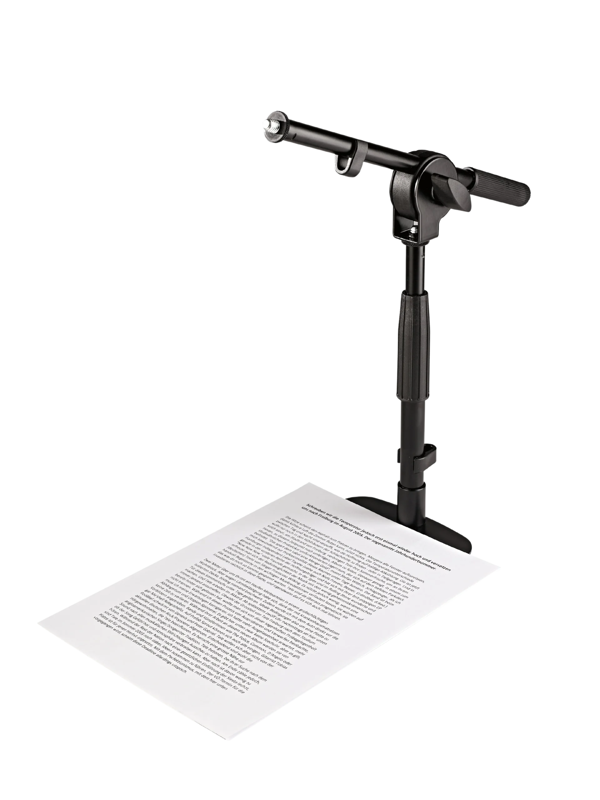 The flat foot construction keeps the stand stable on hard surfaces while minimizing interference with other desktop equipment, and the 3/8″ threaded connector ensures compatibility with standard microphone clips and adapters.