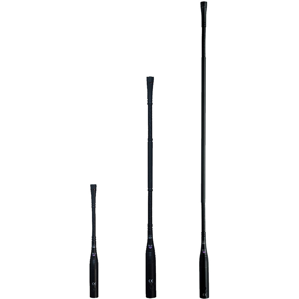 The DAM Series GN E gooseneck modules for fixed and mobile installation comes with an integrated XLR phantom power adapter with 250Hz bass rolloff, LED ring and ON/OFF jumper. It connects to any standard mixer input with 9V – 52V power supply. The DAM Series GN E gooseneck modules are available in three different lengths: 15cm (6in), 30cm (12in), 50cm (20in). They work perfectly with the extensive range of mounting accessories available in the AKG catalog. The gooseneck module fits all DAM Series capsules, CK31, CK32, CK33, CK47 and CK80, via highly reliable contacts.