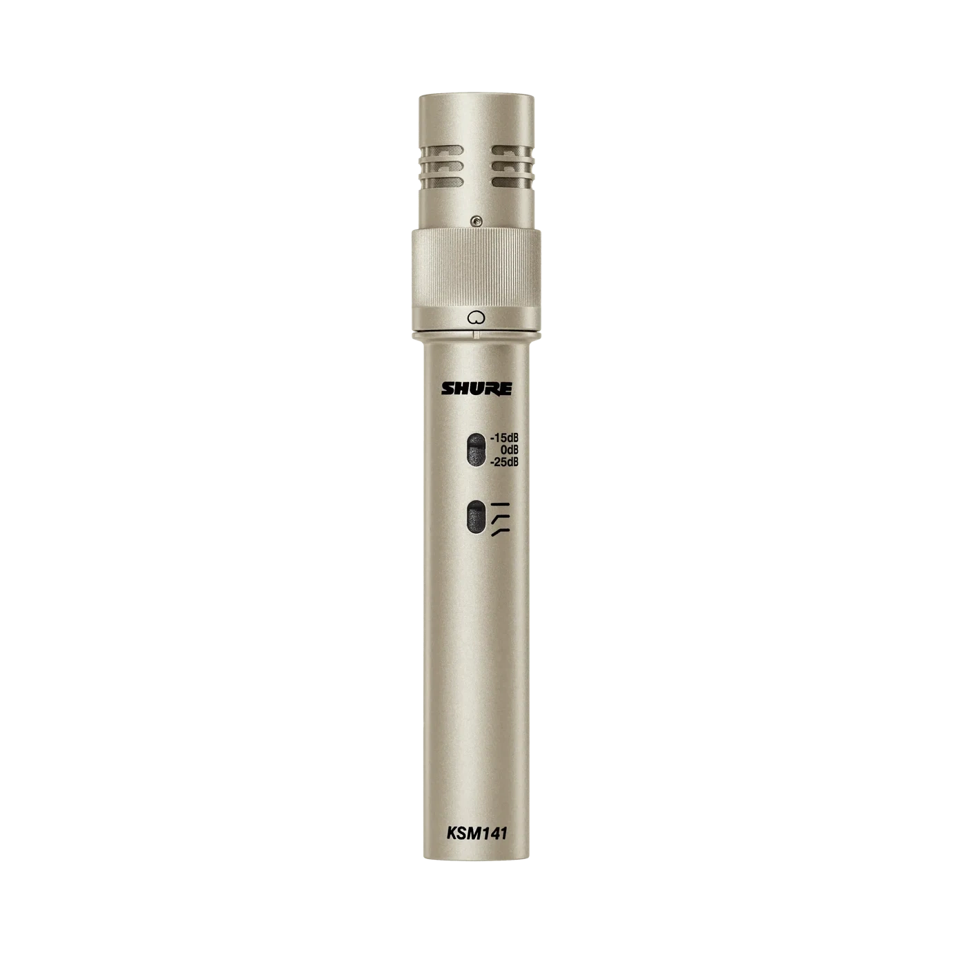 The Shure KSM141 is a professional end-address condenser microphone designed for instrument recording and live applications, featuring mechanically switchable cardioid and omnidirectional polar patterns with a gold-layered Mylar diaphragm.