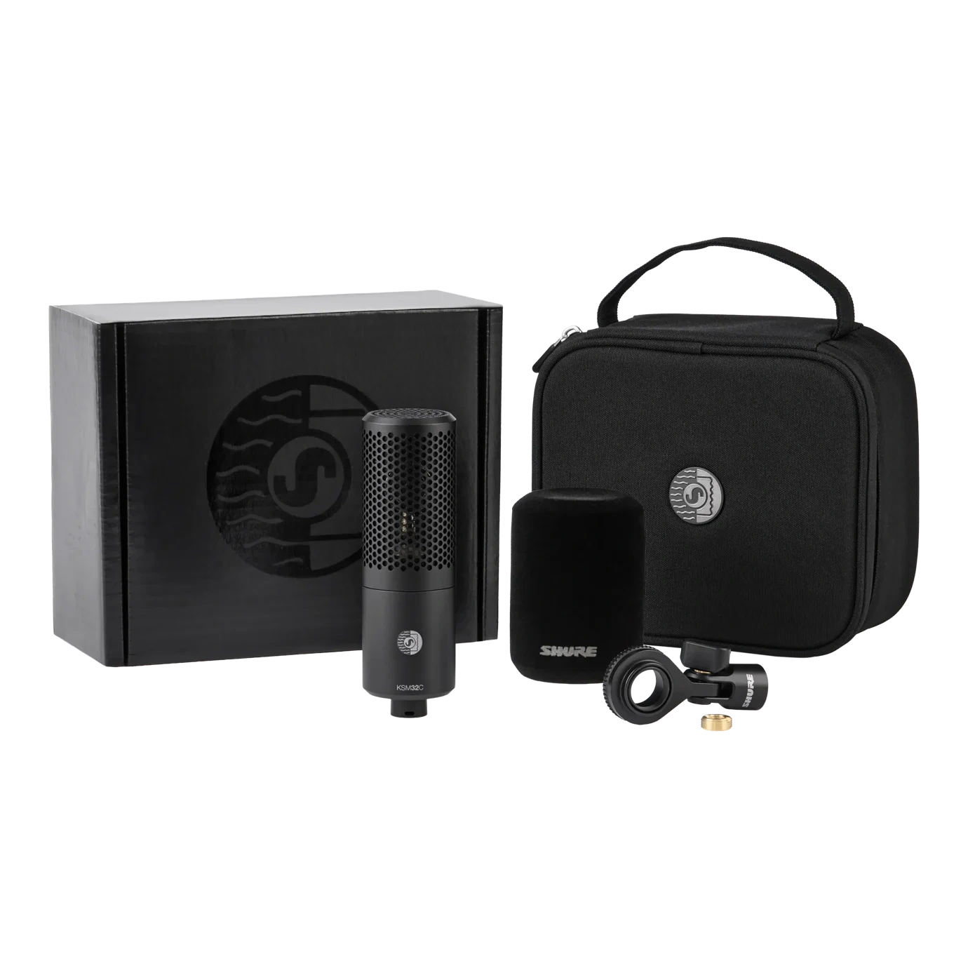 The Shure KSM32C/HM Stage Kit pairs a precision-engineered 3/4″ cardioid condenser microphone with a hard mount, premium case, and flocked foam windscreen for stage-ready deployment.