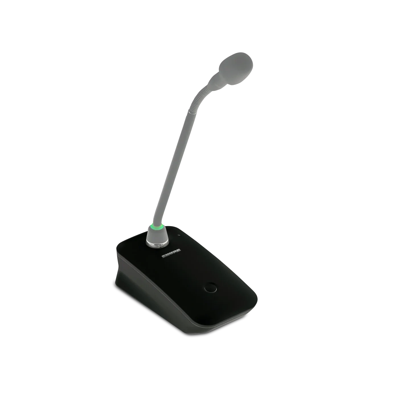 The desktop base form factor accommodates standard gooseneck microphone capsules and integrates cleanly into conference and presentation environments where a discreet, table-mounted transmitter is required.