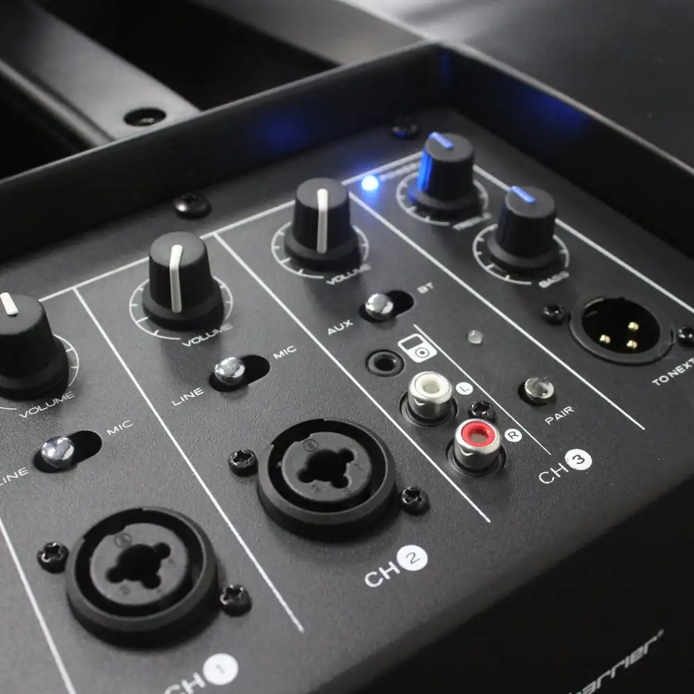 The Sound Barrier CONCIERTO 500 is a compact, all-in-one portable line array PA system with 1000W power, Bluetooth streaming, built-in mixer, and 180° coverage—perfect for churches, DJs, and live events.
